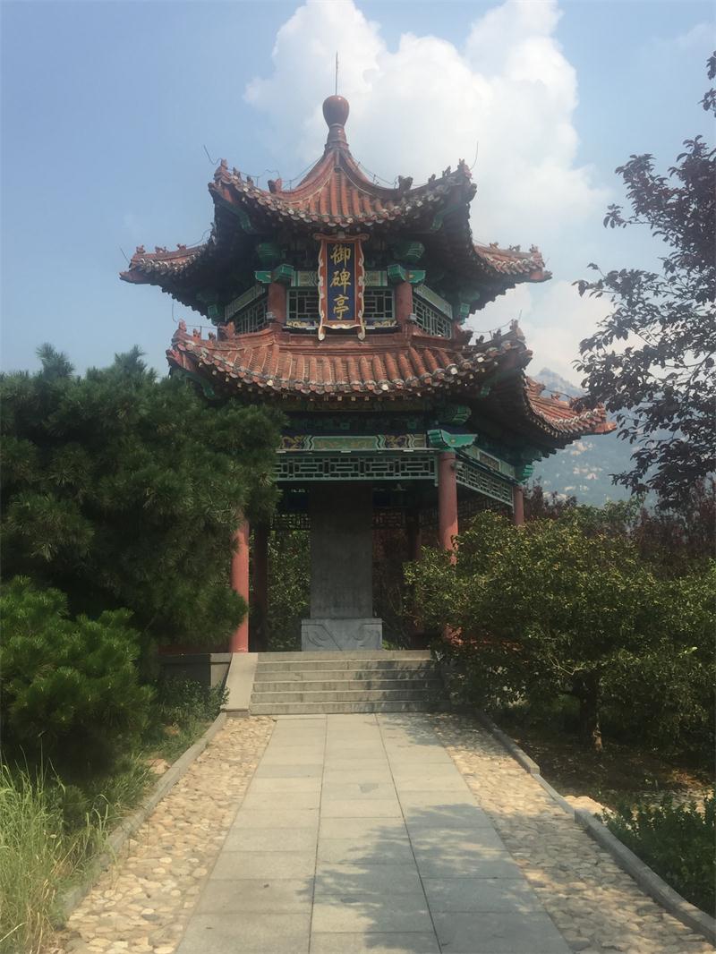 該亭高 8 米, 六角重檐尖頂 ,亭內(nèi)置“ 御碑”, 碑高 3.15米, 寬 1.10 米, 厚 0.37米, 清代風(fēng)格。碑刻康熙四十二年御制詩一首, 作者是清圣祖康熙皇帝, 名玄燁。目前這里已成為泰山廣場的一大文化景點(diǎn)。