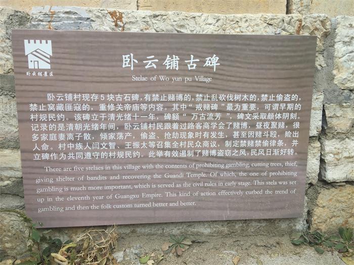 村居房舍大都以石頭壘砌,頗有特色。石屋,石街,石道,石墻,狗窩、雞窩、石槽、石臼是石頭的,就連一些日常器具都是石頭的。走進(jìn)村里儼然走進(jìn)一座石頭城堡。房上石頭各有其名:里檐、脊檐、挑翅、擋捎、腰枕、拴馬石……陡峭的擋捎上掛著長長的壓捎石。挑翅、擋捎、壓捎石之間用由子、桪子相互“擒”著,像掛在空中一樣。這里的一切記載著臥云鋪人自古以來勤勞、團結(jié)、善良、寬容的美德。